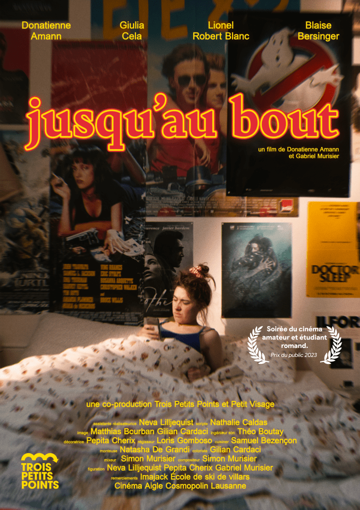 J’ai écrit « Jusqu’au bout » en 2021, en une soirée, après un énième refus à un casting. J’ai écrit ce scénario sans prétention, avec juste l’envie de rire de cette vie absurde de comédien où l’on est sans cesse en train de se vendre, d’espérer et d’échouer. J’ai appelé Gabriel Murisier pour m’aider à réaliser ce film et on a réuni des gens super et motivés. En trois jours, on a tourné « Jusqu’au bout », co-produit par les Trois Petits Points. Ce fût un joyeux bordel et le résultat deux ans plus tard est tout aussi joyeux et tendre qu’a été le processus de création de ce court-métrage, le premier pour ma part. Donatienne Amann